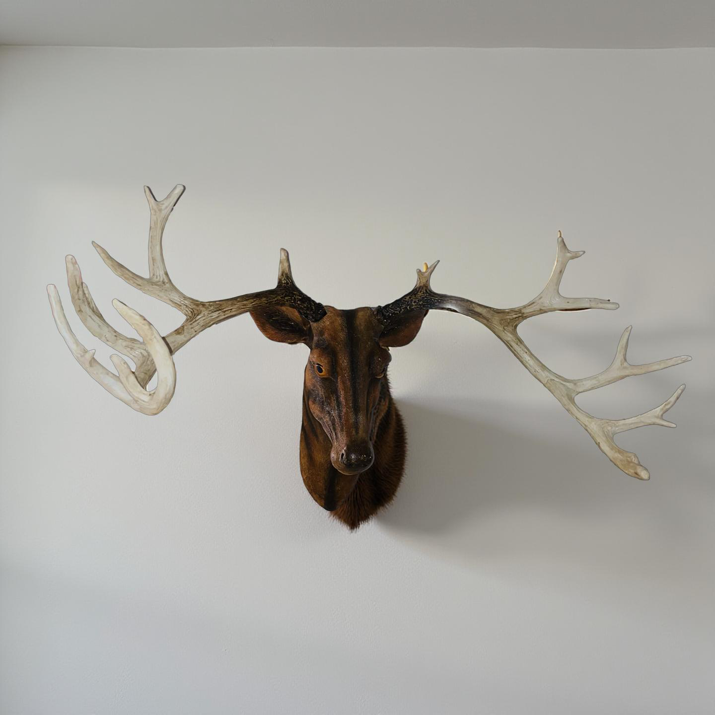 Hand-painted with realistic brown, beige, and ivory tones, giving the antlers and head a textured, authentic appearance. The matte and semi-gloss contrast enhances depth and visual impact.